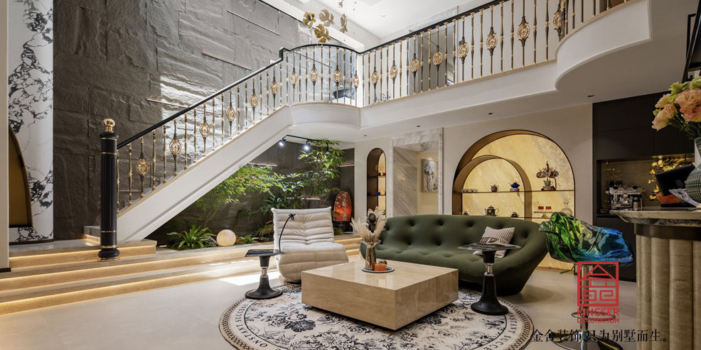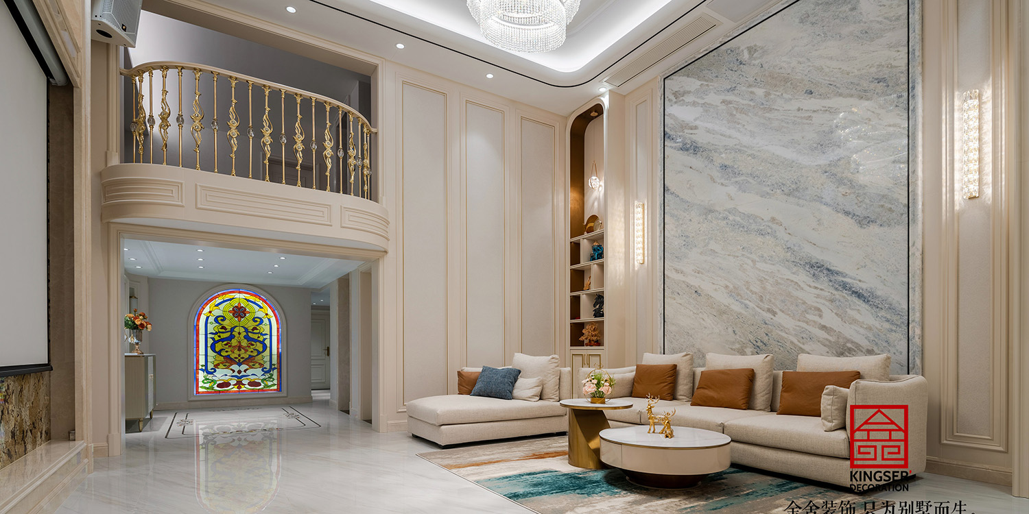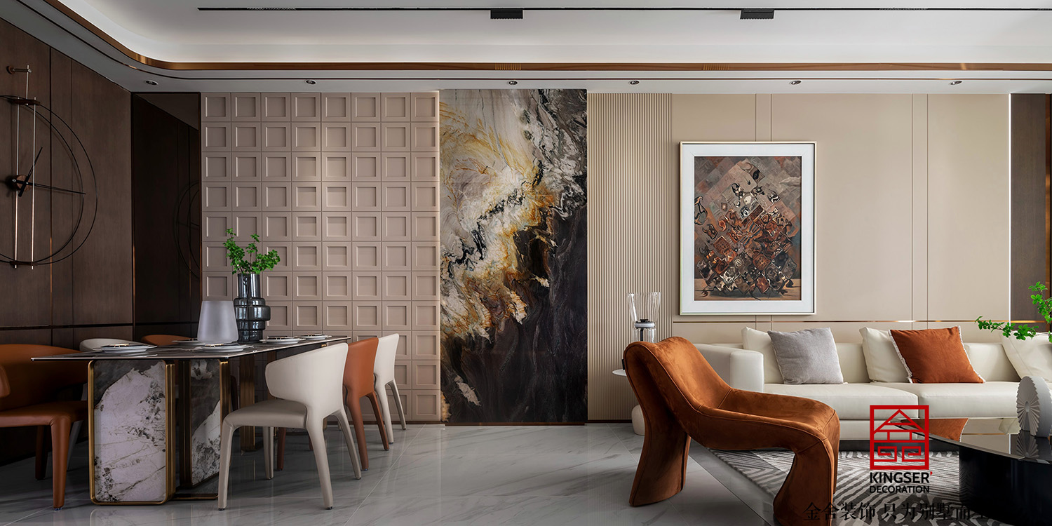 褪去城市繁冗華麗的外殼,回歸至與人的內(nèi)在共鳴,斑駁的光影在客廳空間徜徉,大理石與墻板的搭配,釋放出一種優(yōu)雅、沉靜及治愈的氛圍感,貫穿于整個別墅裝修空間的動線。